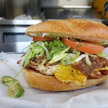 Grilled Steak and Chorizo, Oaxaca Cheese, Jalapeños, Lettuce, Tomatoes, Mayo and Refried Beans served on a Mexican Sub Roll.