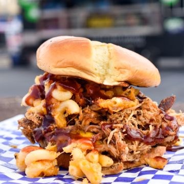 Burger/Cheese, Da Hogfather or Funky Chicken topped with OG Mac & BBQ Sauce.